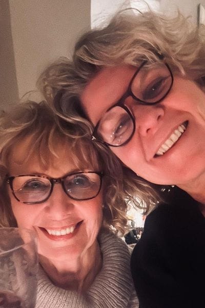 A mother and daughter in a selfie, both smiling and holding a wine glass.